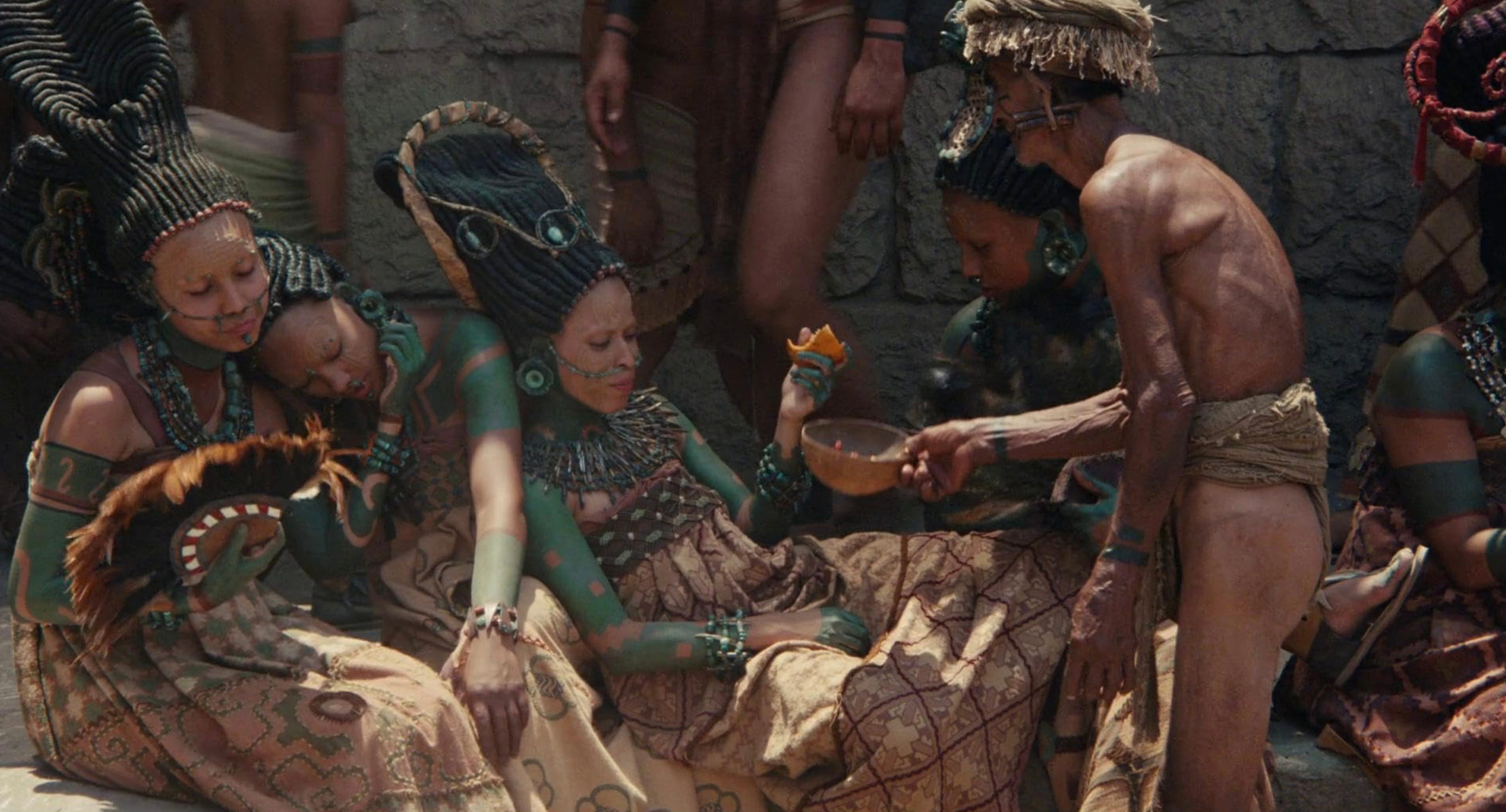 Women with blue paint dripping from their hands approach the prisoners and start rubbing the blue paint on their faces and bodies, preparing them for something we’re not precisely sure of yet.