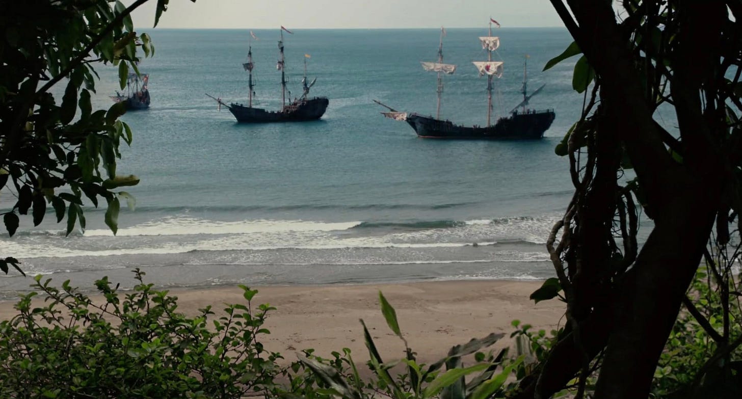 Only two of the men in the raider party remain, and they chase Jaguar Paw to the beach, where they all stop and stare out at the water. It’s only once we pan around them that we see what has them so agog.