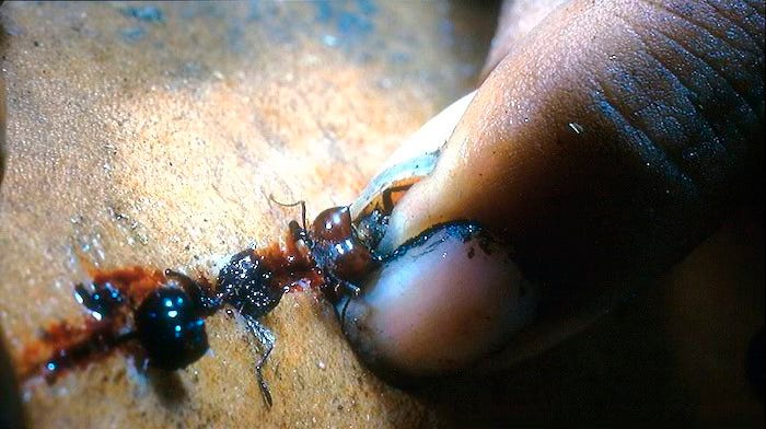 I’m not a huge fan of the cut backs to the wife and kid in peril in the well. It plays fine the first time you watch the flick, but on subsequent viewings it takes the air out of the film and the main storyline. But there are a few highlights. The first is the scene where the mother uses the mandibles of an ant to suture a wound on her son’s leg. Did they actually do this back then? Genius!