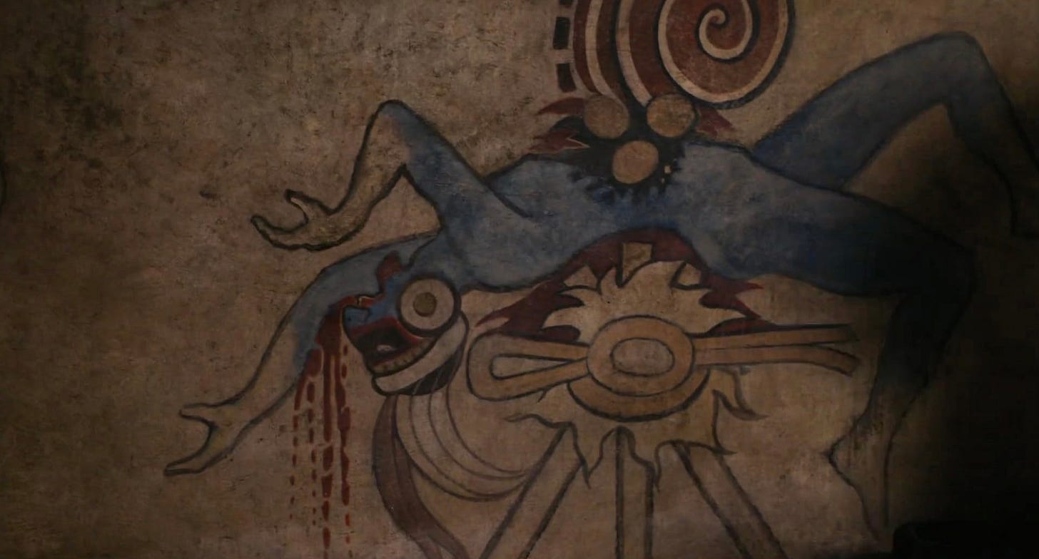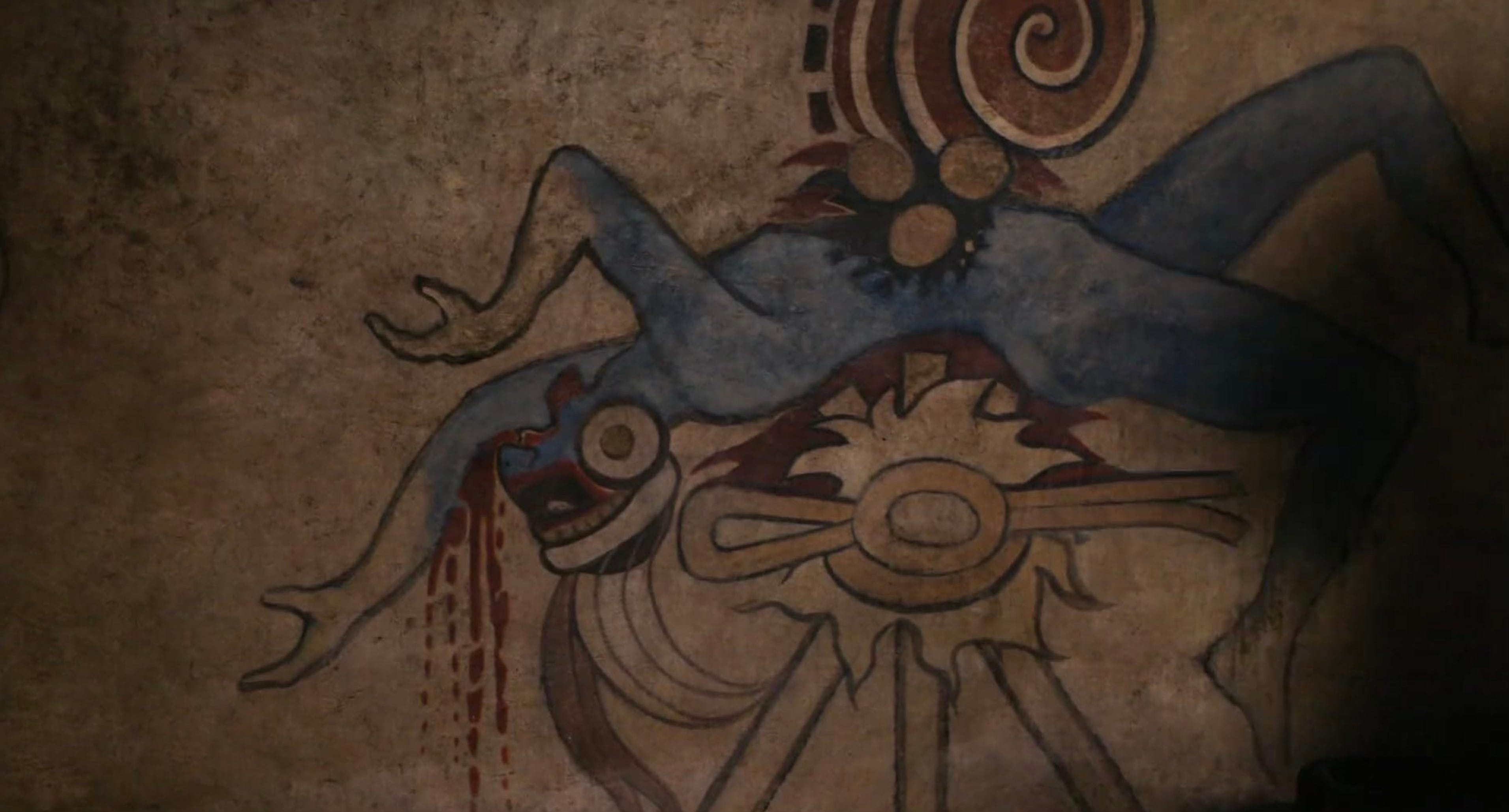 It continues with the entire human sacrifice/eclipse scene. Surreal and insane to think it was anything close to this in reality. If so, holy fuck! Can you imagine how terrifying it must have been as one of these prisoners? Good lord. The guys are led into a tunnel where they see figures painted blue on the wall having their innards torn out, their hearts ripped out and heads chopped off.